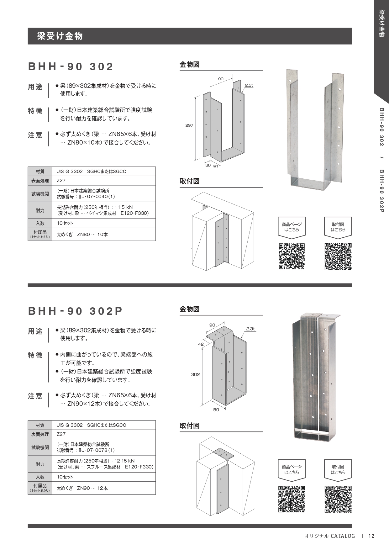 | 梁受け金物(釘タイプ) | BHH-90 302P | 製品詳細 取付図 | ||||