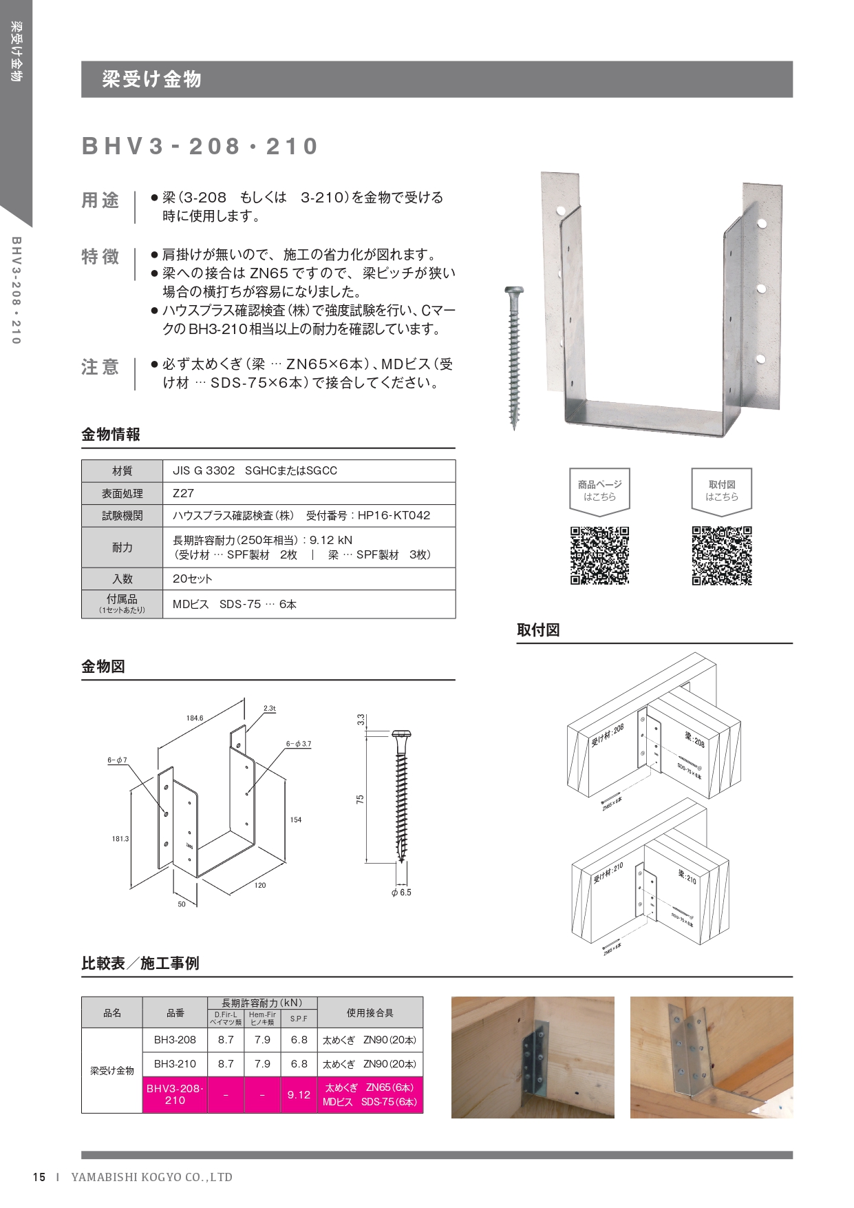 | 梁受け金物(ビスタイプ) | BHV3-208・210 | 製品詳細 取付図 | ||||