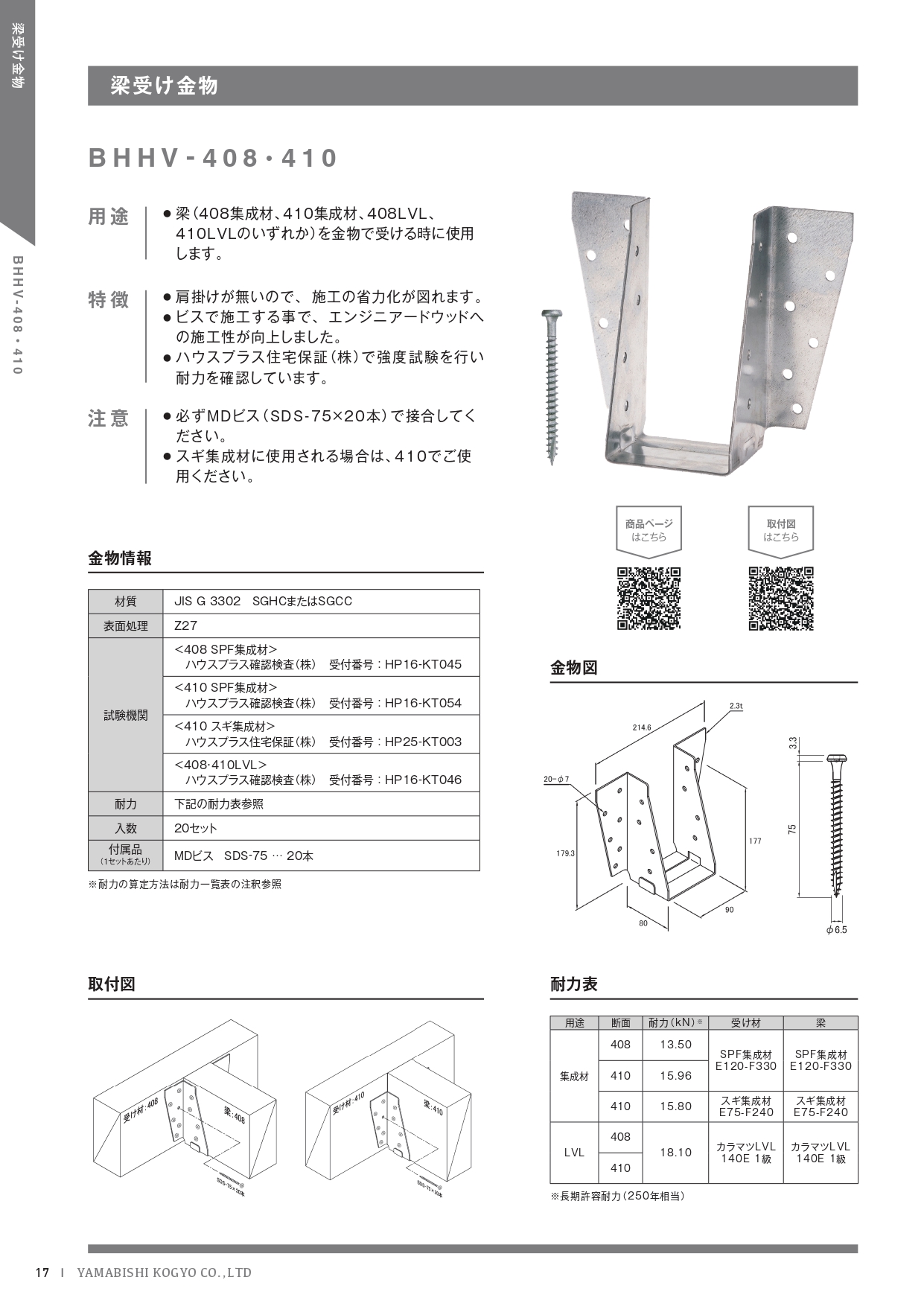 梁受け金物(ビスタイプ) BHHV-408・410(LVL)