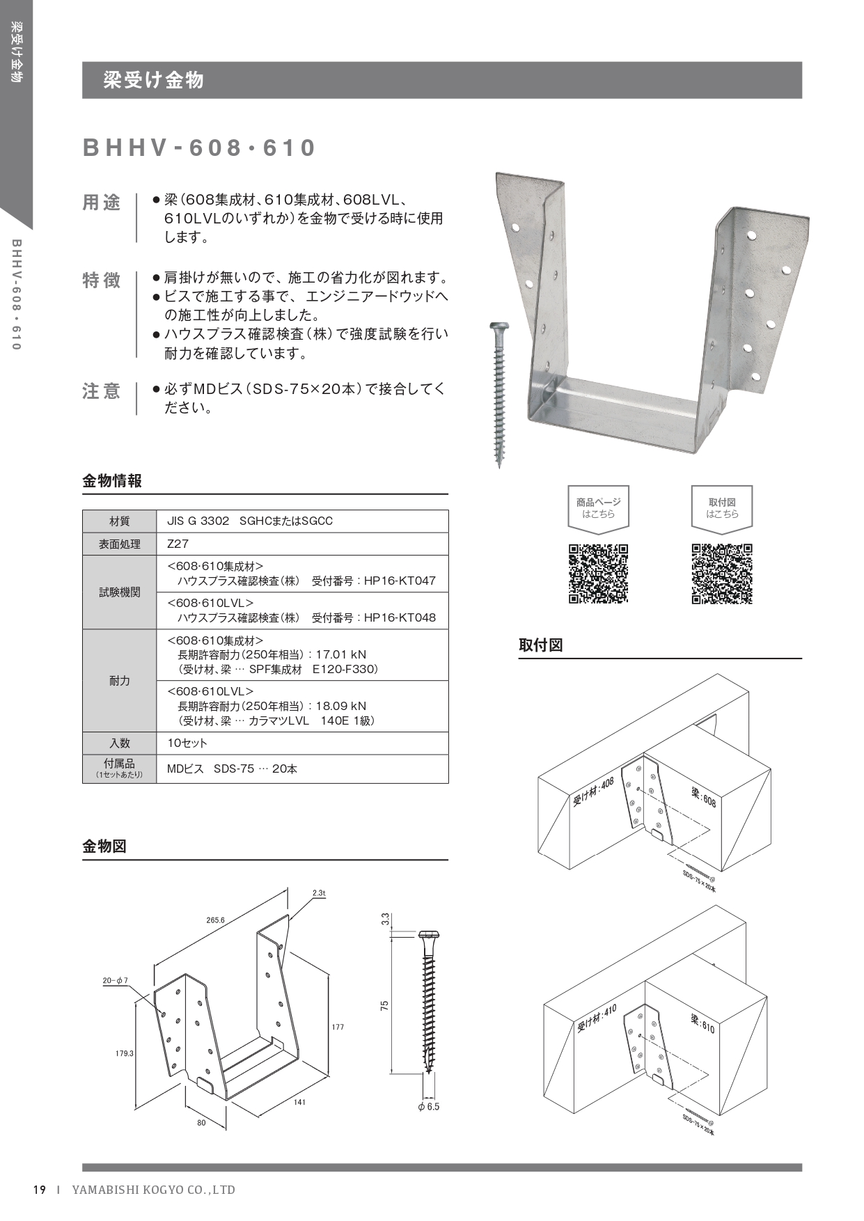 ・肩掛けが無いので、施工の省力化が図れます。 ・ビスで施工する事で、エンジニアードウッドへの施工性が向上しました。 ・ハウスプラス確認検査㈱で強度試験を行い耐力を確認しています。