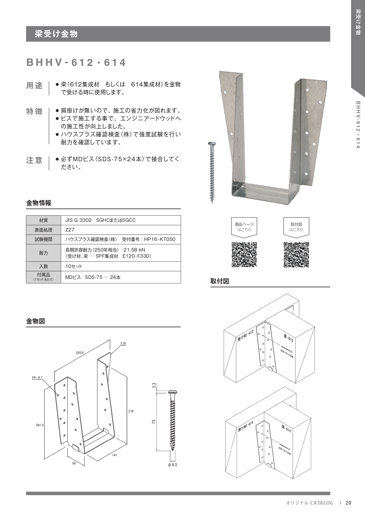 | 梁受け金物(ビスタイプ) | BHHV-612・614 | 製品詳細 取付図 | ||||