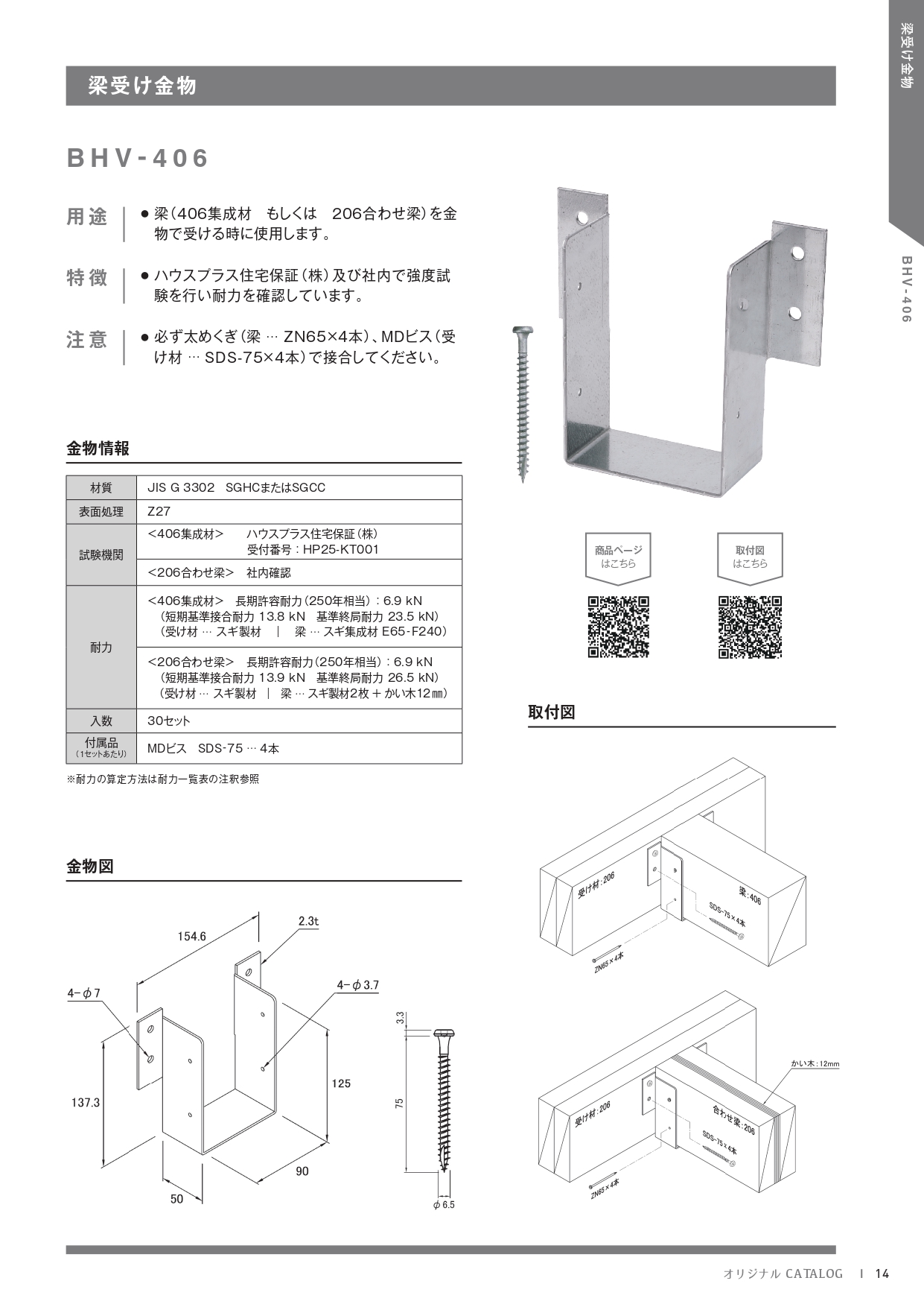 | 梁受け金物(ビスタイプ) | BHV-406 | 製品詳細 取付図 | ||||